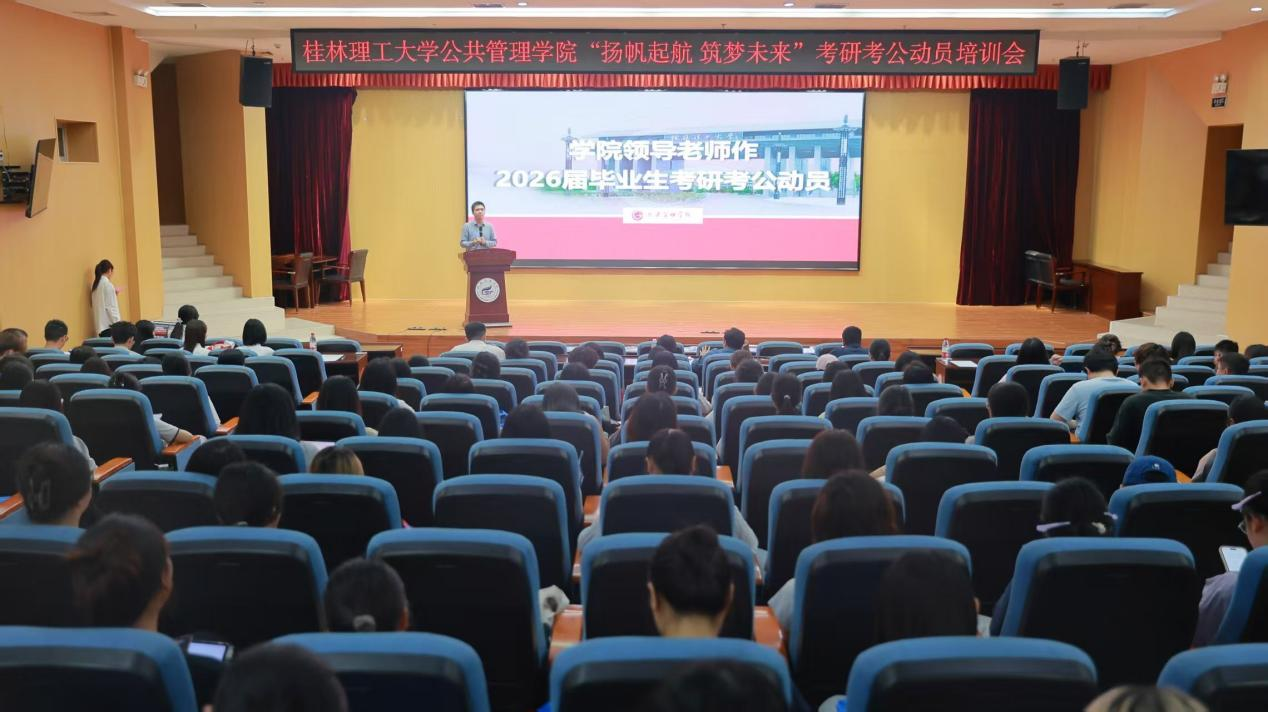 2025年10月15日,我院于雁山校区图书馆报告厅成功举办“扬帆起航·筑梦未来”2026届毕业生考研考公动员培训大会。会议由陈爽同学主持,学院党委书记陆平、副书记夏勇超、全体辅导员、毕业班班主任及2026届毕业生共同参加。