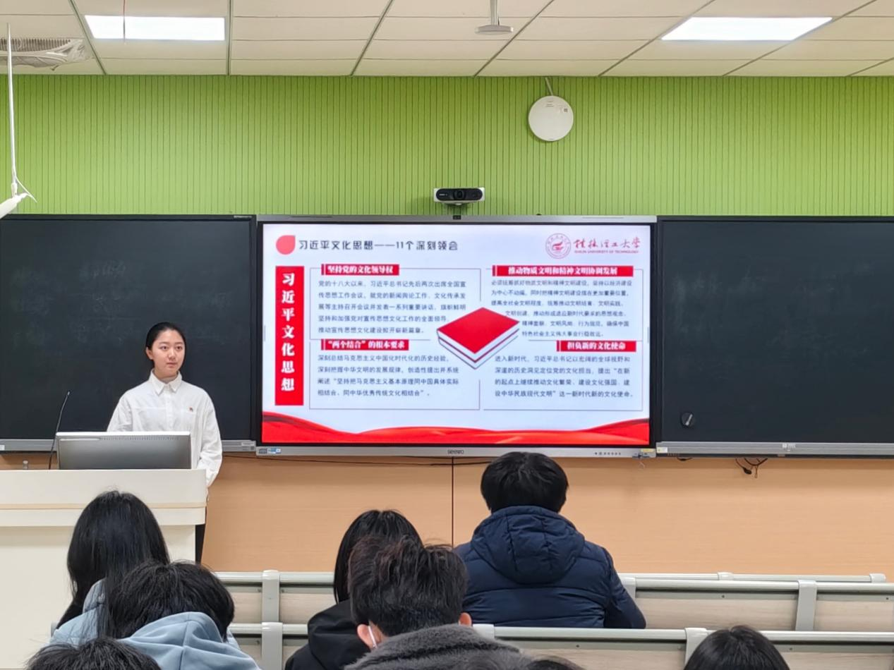 为深入学习贯彻习近平文化思想,引导青年学生坚定文化自信、勇担时代使命。12月5日,桂林理工大学公共管理学院青马班第三讲课程《织锦承文脉 青春铸自信 —— 以习近平文化思想绘就新时代青年担当》于06102教室顺利开展,学院全体青马班成员参与本次学习。